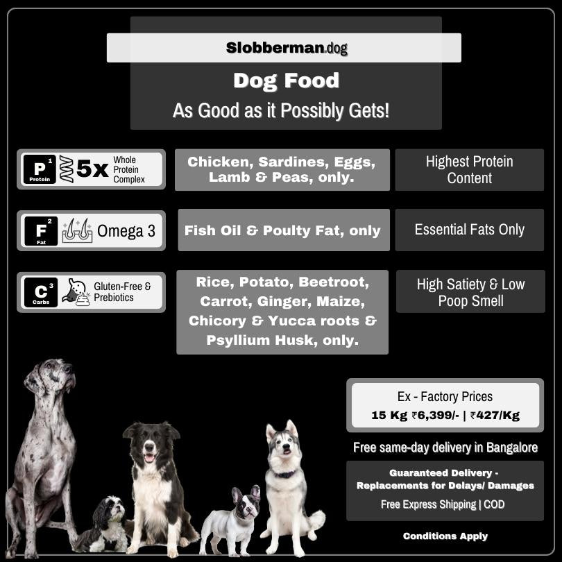Slobberman.dog dry dog food is manufactured at our own micro-factory in Bangalore using a proprietary process and exacting standards. Every batch of kibble is meticulously crafted and passes the most stringent tests so we feed our own fur-babies the very same products & batches we offer you.